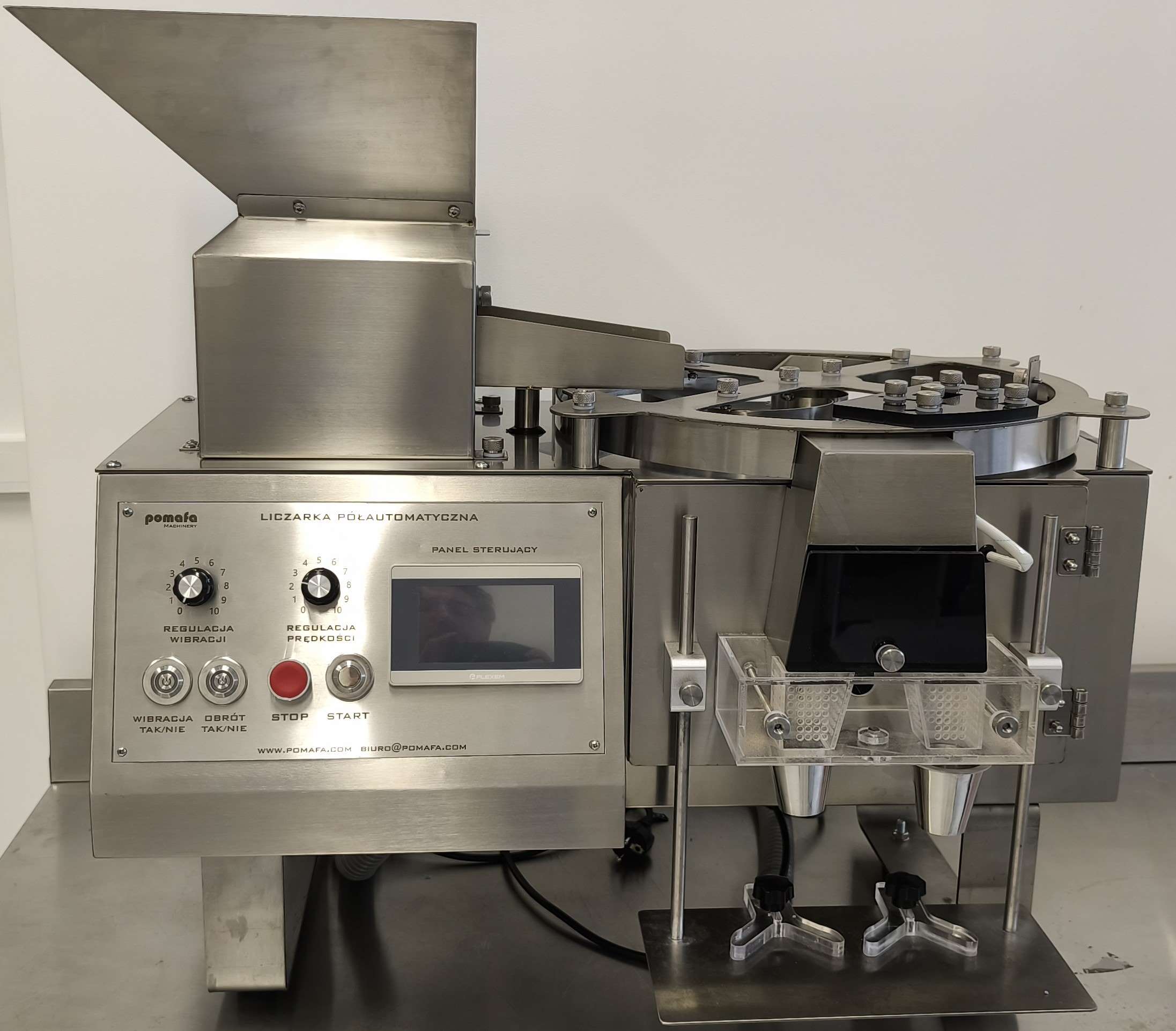 Liczarka Półautomatyczna to urządzenie służące do precyzyjnego liczenia i zasypywania kapsułek oraz tabletek. Dzięki zastosowaniu precyzyjnych czujników optycznych zapewnia wysoką dokładność pracy. Urządzenie wykonane jest ze stali nierdzewnej, co ułatwia utrzymanie wysokich standardów higieny i spełnia wymagania normy GMP. Maszyna posiada system odpylania doprowadzony do podajnika wibracyjnego oraz do lejów zsypowych. Liczarka nie wymaga stosowania form do różnych kształtów produktów.