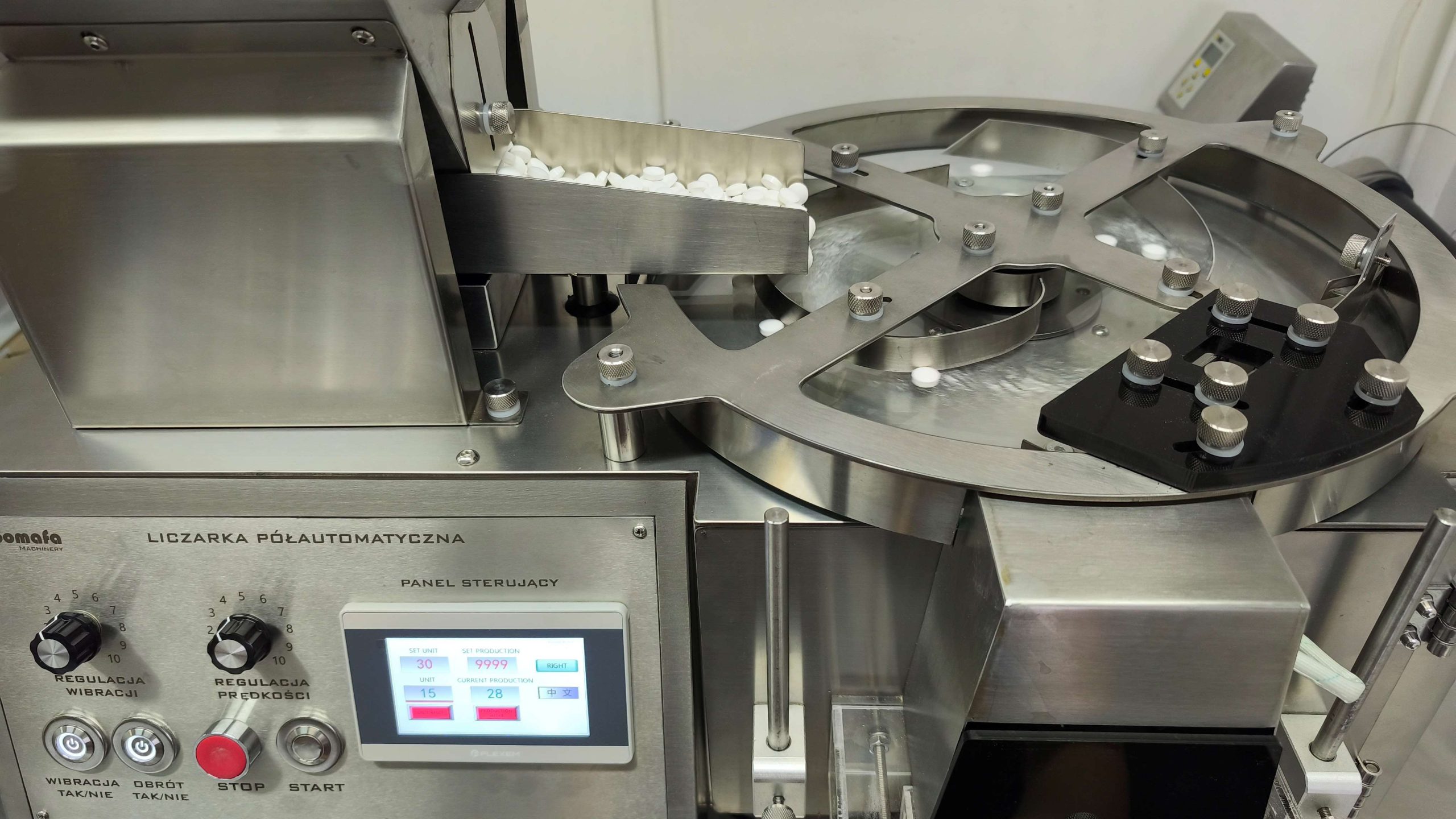 Liczarka Półautomatyczna to urządzenie służące do precyzyjnego liczenia i zasypywania kapsułek oraz tabletek. Dzięki zastosowaniu precyzyjnych czujników optycznych zapewnia wysoką dokładność pracy. Urządzenie wykonane jest ze stali nierdzewnej, co ułatwia utrzymanie wysokich standardów higieny i spełnia wymagania normy GMP. Maszyna posiada system odpylania doprowadzony do podajnika wibracyjnego oraz do lejów zsypowych. Liczarka nie wymaga stosowania form do różnych kształtów produktów.